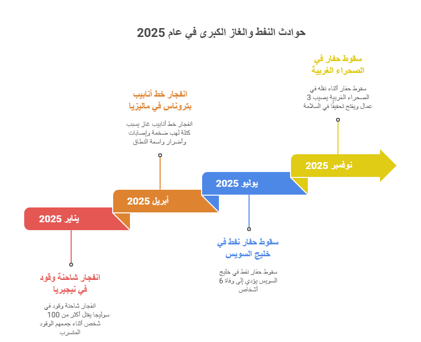 شهد عام 2025 سلسلة من الحوادث المؤثرة في قطاع البترول والطاقة حول العالم، تراوحت بين انفجارات في المصافي، وتسربات نفطية كبرى، وحوادث تقنية في منصات الحفر.