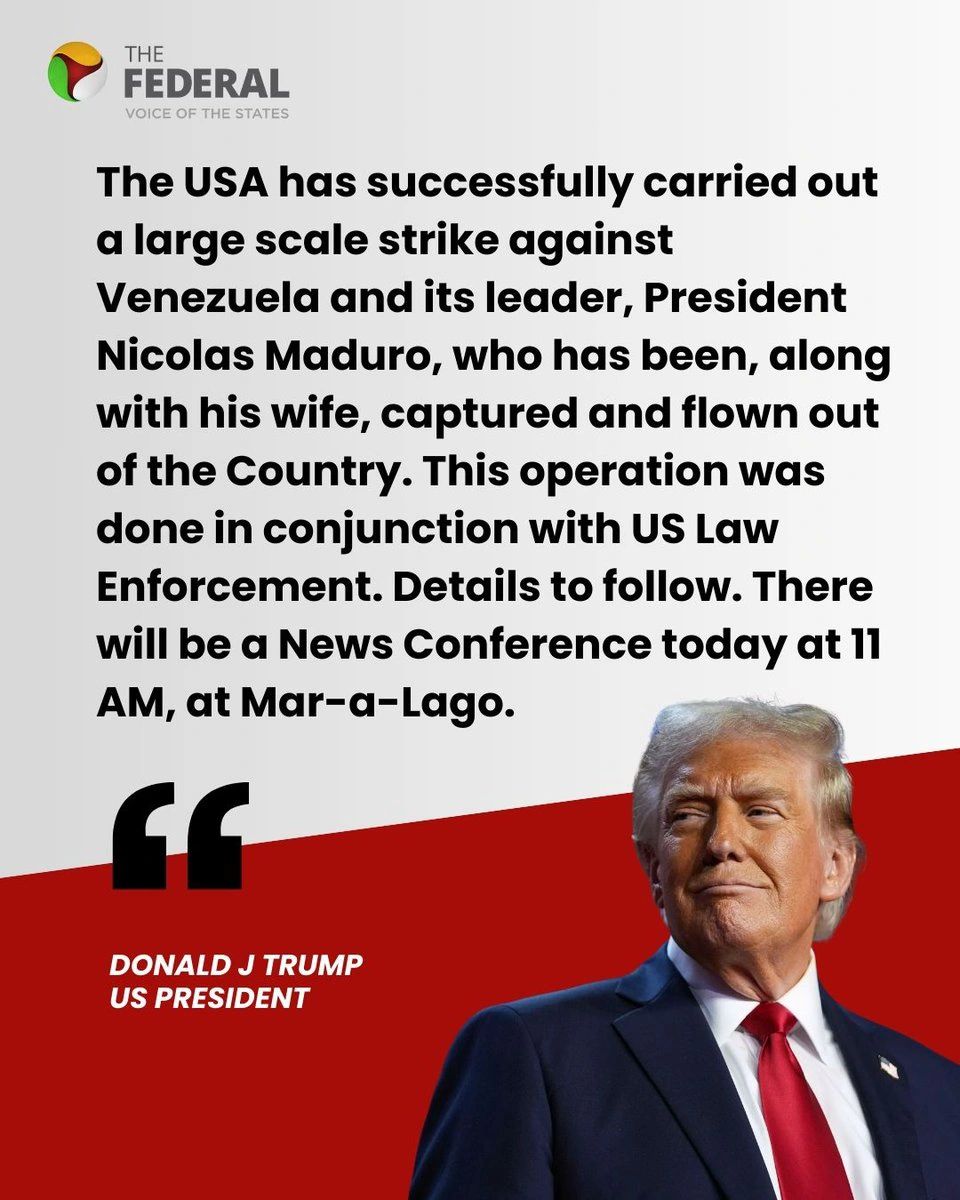 “شنّت الولايات المتحدة عملية عسكرية واسعة داخل فنزويلا، أسفرت عن اعتقال الرئيس الفنزويلي نيكولاس مادورو وزوجته ونقلهما خارج البلاد. ترامب قال إن هذه العملية تمت بنجاح بالتنسيق مع جهات إنفاذ القانون الأمريكية”.